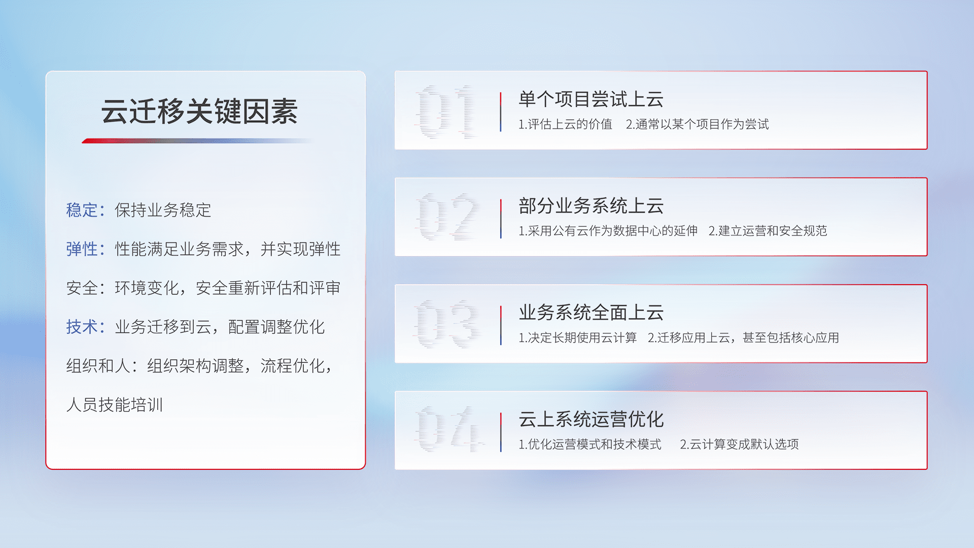 结合实际业务,,,从规划设计、、、云平台选型、、、云原生改造、、、数据迁移、、、、集成交付,,,迁移全过程为客户识别最佳上云路径,,做好风险识别管理,,设计网络架构、、、身份权限、、安全审计合规、、、操作审计、、日志审计、、监控告警策略、、多站点容灾设计等,,对云上基础设施进行整体规划,,,提升IT治理水平,,以满足弹性、、高可用、、高性能的需求。。。。