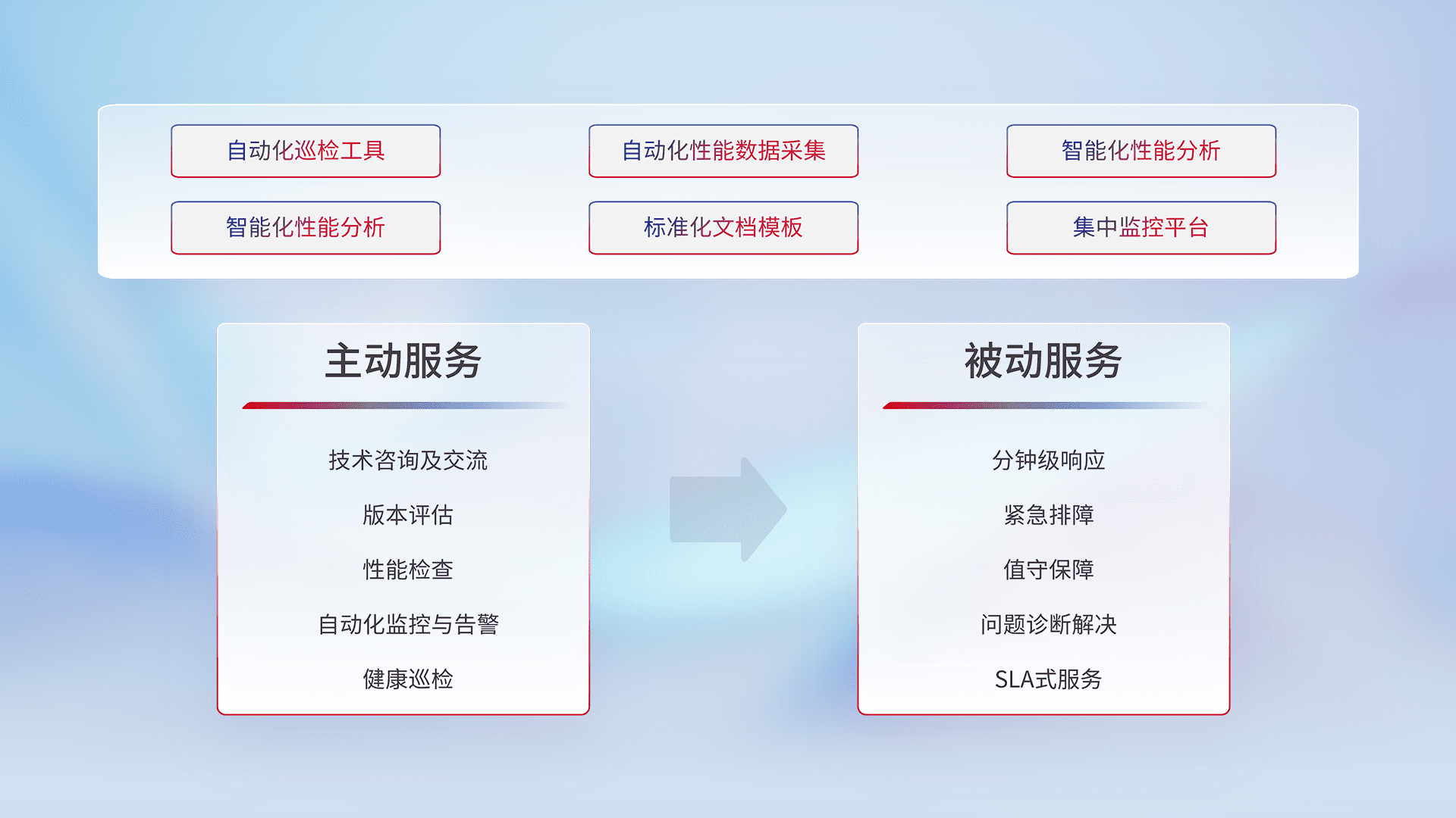 智能化工具和标准化文档,,,保障服务质量,,提供主动服务(包含技术咨询、、、、版本评估、、、、性能检查、、自动化监控与告警、、、健康巡检)和被动服务包含(分钟级响应、、紧急排障、、、值守保障、、、、问题诊断解决、、SLA服务)。。。